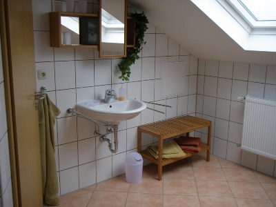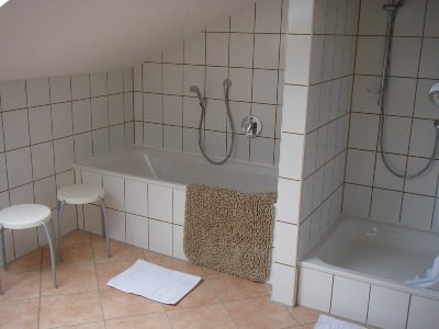 Großes, helles Bad mit Waschbecken, Badewanne, Dusche, WC