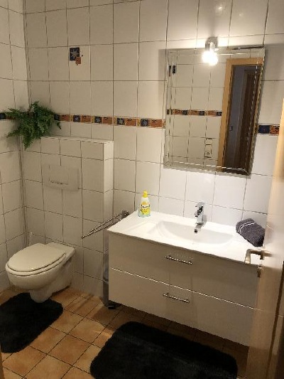 Kleines freundliches Bad mit Waschbecken, Dusche, WC