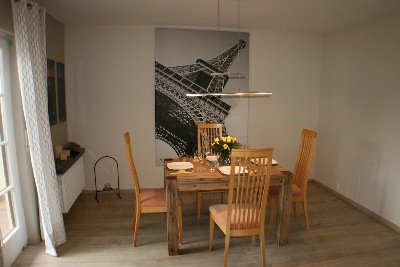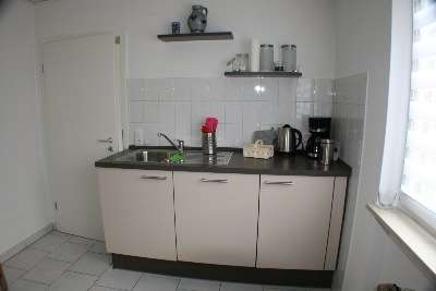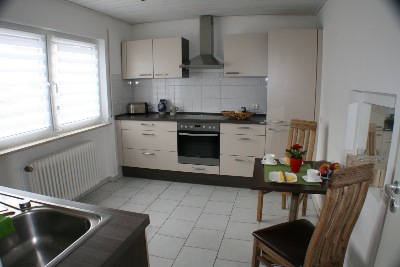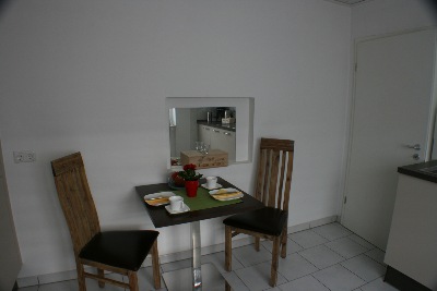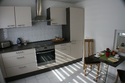 - Küche mit kleinem Esstisch, Cerankochfeld, Backofen, Mikrowelle, Kaffeemaschine, Toaster, Kühl-Gefrierschrank, Wasserkocher Spülmaschine